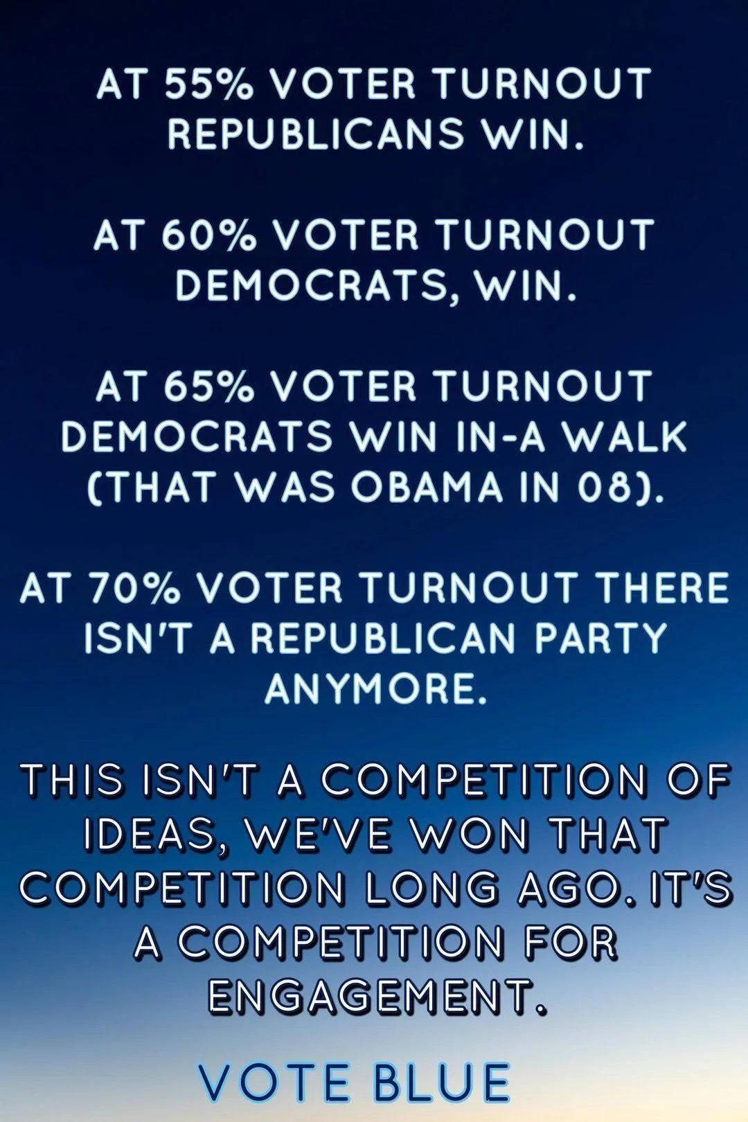90%, 80%, hell, even 70%. The general wisdom (not necessarily as true today) is that the higher the turnout in U.S. elections, the more likely the democrat is to win. That was the driver of the attached:
