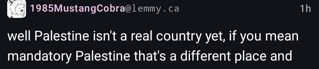 well Palestine isn’t a real country yet, if you mean mandatory Palestine that’s a different place and time. also palastina which was named by the romans was a place IN Judea that had “different people”. aside from history, what isreal has is a group of people who think that they can build a house where other people live and the goverment lets them, the settlers as they are called. Yeah that shit ain’t good. I just want a fucking 2 state so isreal has their half, and gaza/west-bank can have their own place, and just leave each other the fuck alone.