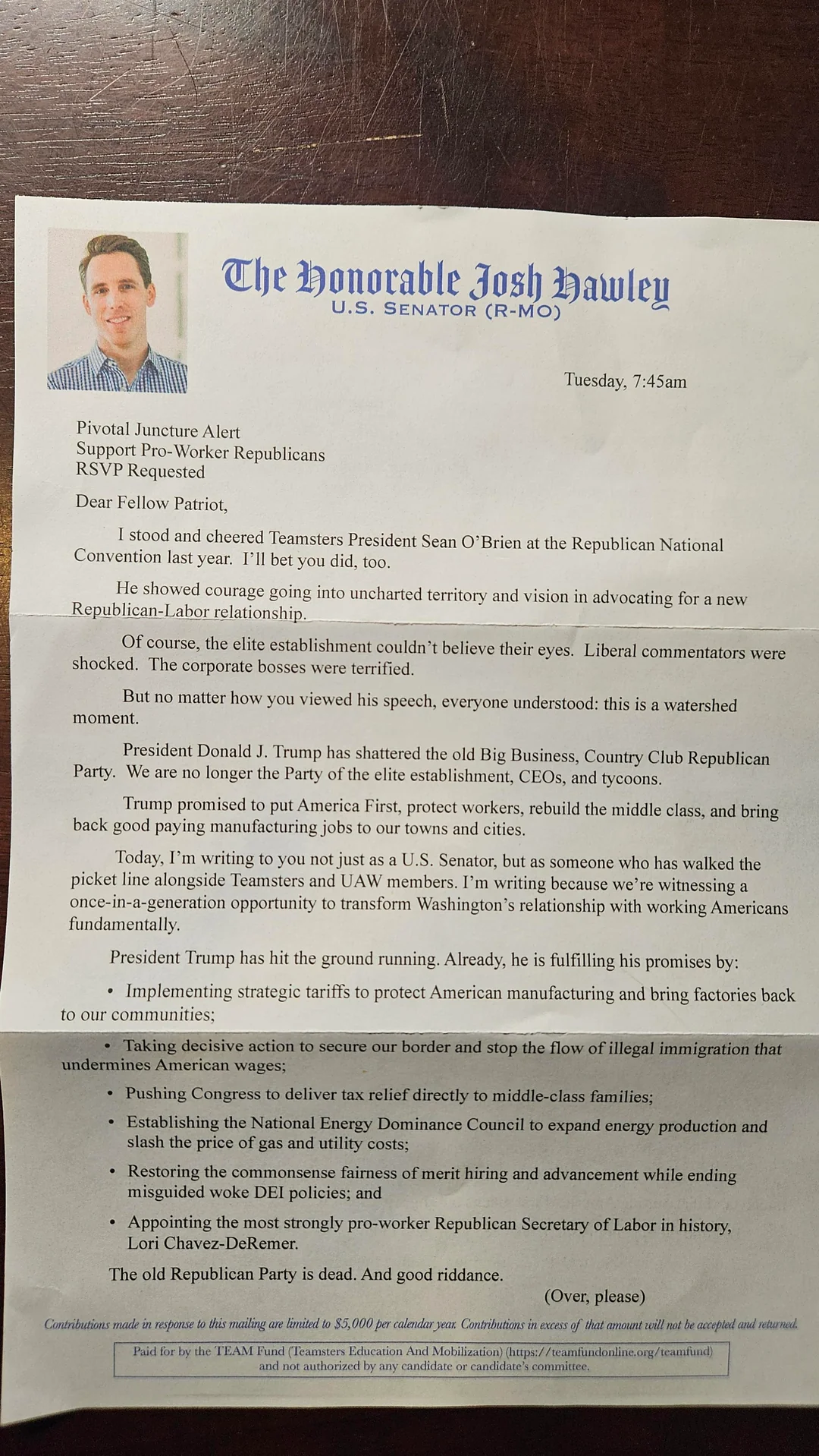 In the letter, Sean O’Brien claims that Trump is creating a new ‘Worker First’ republican party, and implores the reader to donate as much as they can to the Teamster ‘TEAM Fund’, which will be used to: