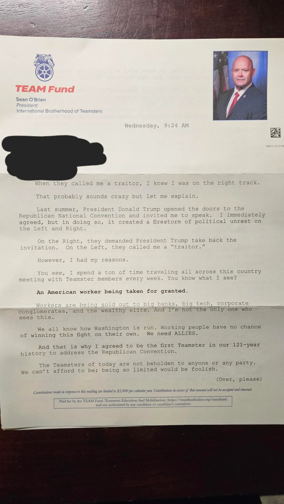 A Teamster posted images of a fund raising letter they received from President Sean O’Brien on r/Union (warning: reddit link).