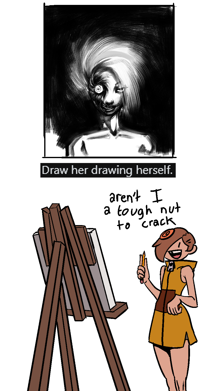 Draw her trying to remember which one is a zucchini and which one is a cucumber.