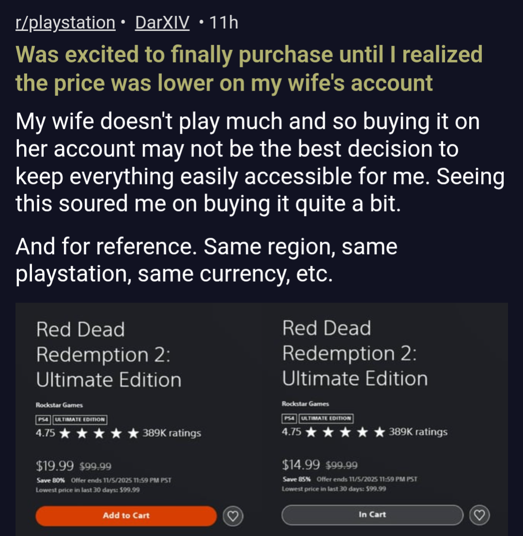 I’m the sort of person that likes proof before I decide to be angry about corporate gouging. So the first thing I did was to look for other sources that discuss this. Vice is reporting on this screenshot and the OG reddit post, there have been no comments from Sony. Insider Gaming is also reporting on this screenshot and OG reddit thread, in addition to discussing an earlier instance where someone reported going onto their browser to look up Astro Bot on the PlayStation Store while being signed out. It was $59.99. when signed in, it appeared as $44.99. Sony likes to call this bullshit dynamic pricing. This means that as you play, Sony is harvesting data about what games you play, how long you play the games in question, along with data in your library which gets fed into an algorithm to determine what price you should pay. This garbage is fucking reprehensible. This is the type of stuff that made me drop consoles and turn to the loving embrace of PC gaming. If I saw shit like this via my digital distributor, I would absolutely stop using them and look for other ways to legally purchase the game, or turn to piracy.