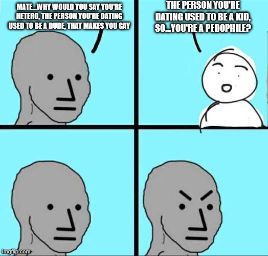 The transphobic argument isn’t that you’d be gay for dating someone who used to be a dude, in their view you’re currently dating someone who still is a dude.
