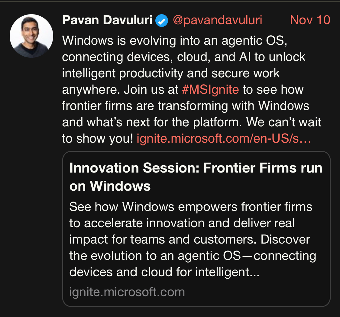 Windows is evolving into an agentic OS, connecting devices, cloud, and AI to unlock intelligent productivity and secure work anywhere. Join us at #MSIgnite to see how frontier firms are transforming with Windows and whatās next for the platform. We canāt wait to show you!