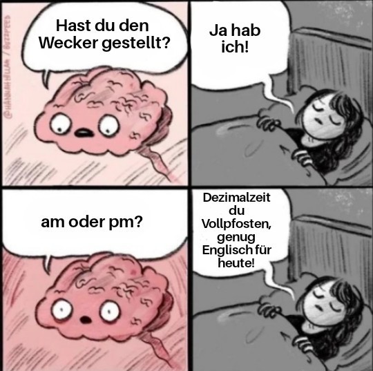 minus-squareRanzigFettreduziert@feddit.orglinkfedilinkarrow-up3·7 months agoAber halb 8 sagt man ja auch, das wäre nach deiner Logik um 4, nicht 7:30.