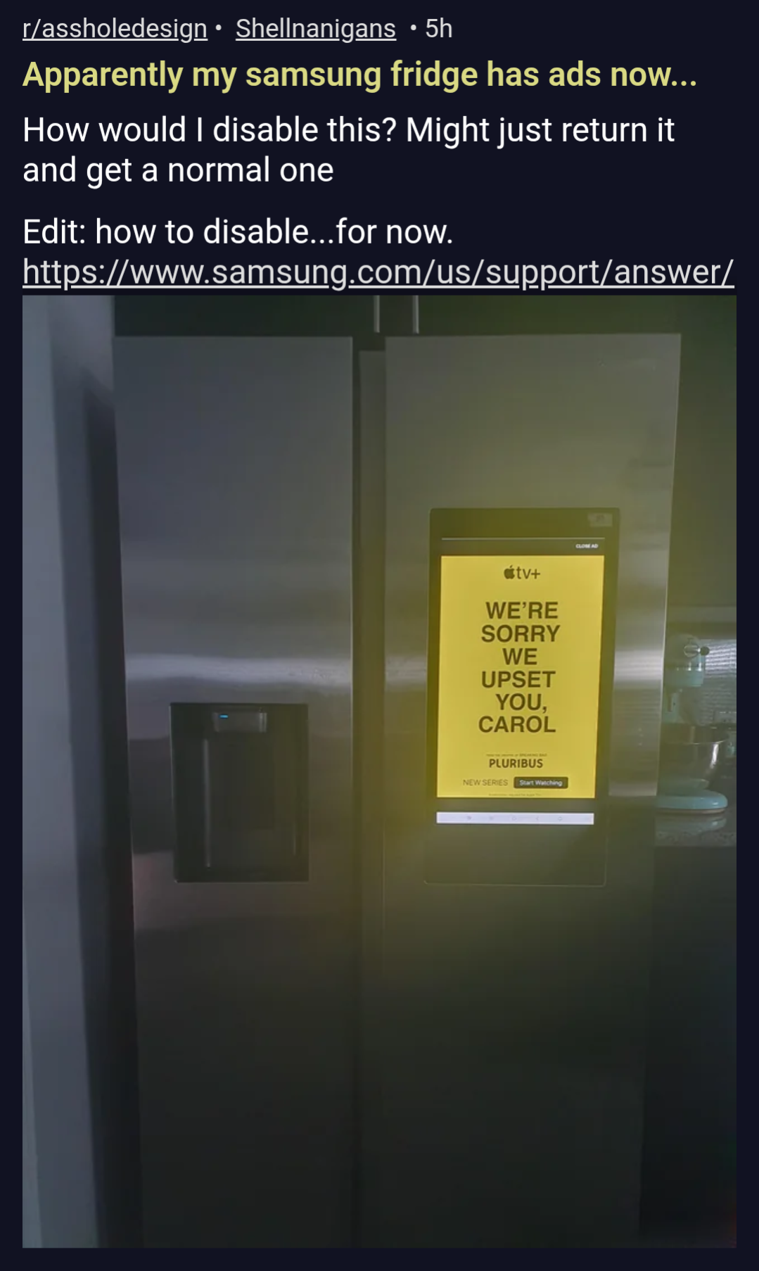 Smart features. Why the fuck do you need smart features on a fridge? Even if it’s using AI vision to scan for inventory… Just no, fucking no. That’s more personal data on you to be bought, sold, data breached, and utilized to fuck you somehow.