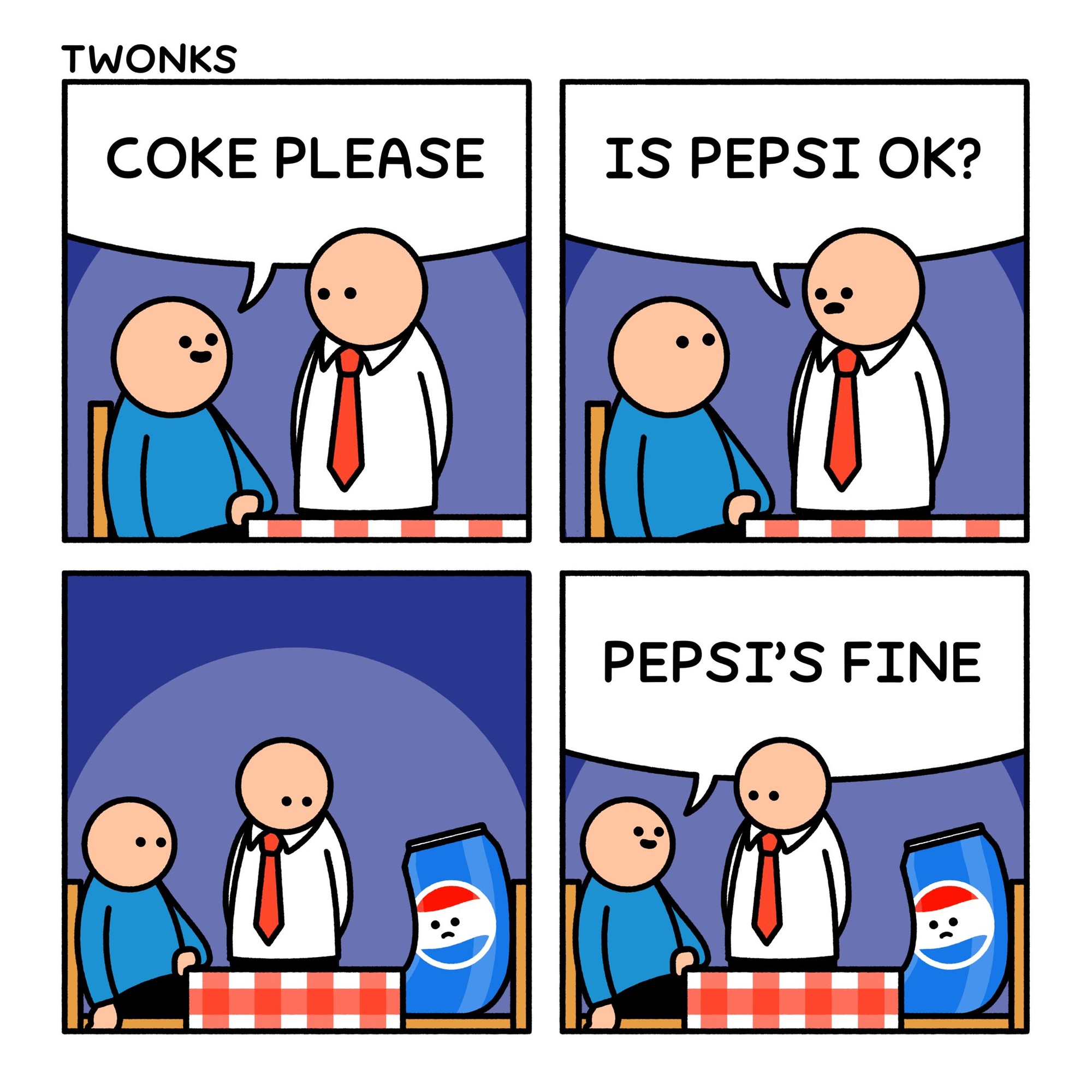 No. How dare you?This reminds me of the time I went on vacation with my brother (solid coke only guy; ftr I don’t drink soda, I drink tea, that’s a whole other meltdown in similarity lol) and we wound up in a “1950’s” cosplaying shopping square. Coke memorabilia EVERYWHERE. My brother was dying cause all the stores and restaurants we’d been to were Pepsi only. He excitedly goes into the convenience store with a display window full of coca cola bottles, a coca cola fridge and a COCA COLA SOLD HERE sign.