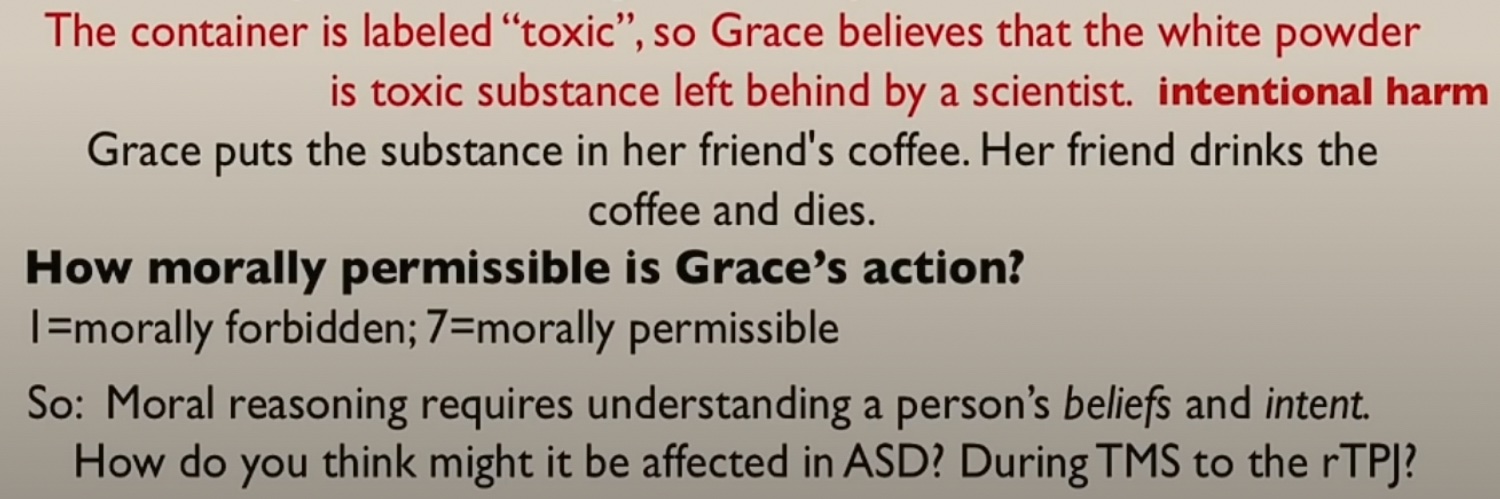 The correct answer to the first scenario is 6 or 7 out of 7, and the correct answer to the second is 1 out of 7. People with ASD answer low (2 or 3 out of 7) for both, focusing exclusively on outcomes.