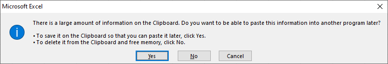 removed, my computer has 128 gigabytes of RAM. It’s a tiny god. The fact that I have as many as 100 cells copied to the clipboard (which is the threshold that triggers this stupid message, if you’ve ever wondered) is not even a rounding error. I’m sure this was marginally important in 1982 or whenever this was first coded into Excel, but today my computer could lose an entire megabyte of memory or maybe even ten down between the couch cushions and neither of us would notice.