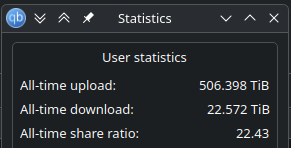 I don’t remember when I set this instance up, but it’s been a few years, yeah. Maybe 3 or 4. I had another torrent client before, but those stats were lost when I switched from windows to linux. I also have another instance of qbittorrent with a few TiB of upload, but that’s mostly used for hoarding wikis.