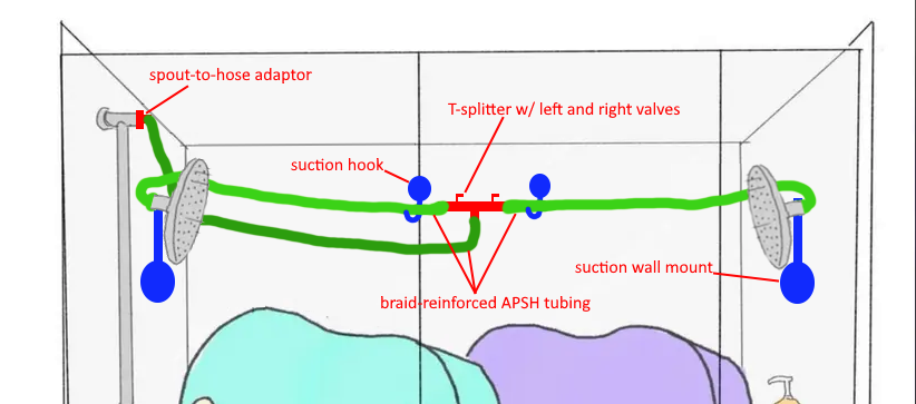 Also when selecting your shower heads and suction wall mounts, put some thought into how easily it will be to redirect the stream: ours aren’t very mobile, and the weight of setup/tubing keeps them kinda fixed at a specific trajectory.