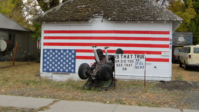 The Faux Nooz sign I added after someone tried to paint over my flag IN BROAD DAYLIGH. The short conversation I had with them indicated they were getting way too much propaganda so it seems like a work in progress