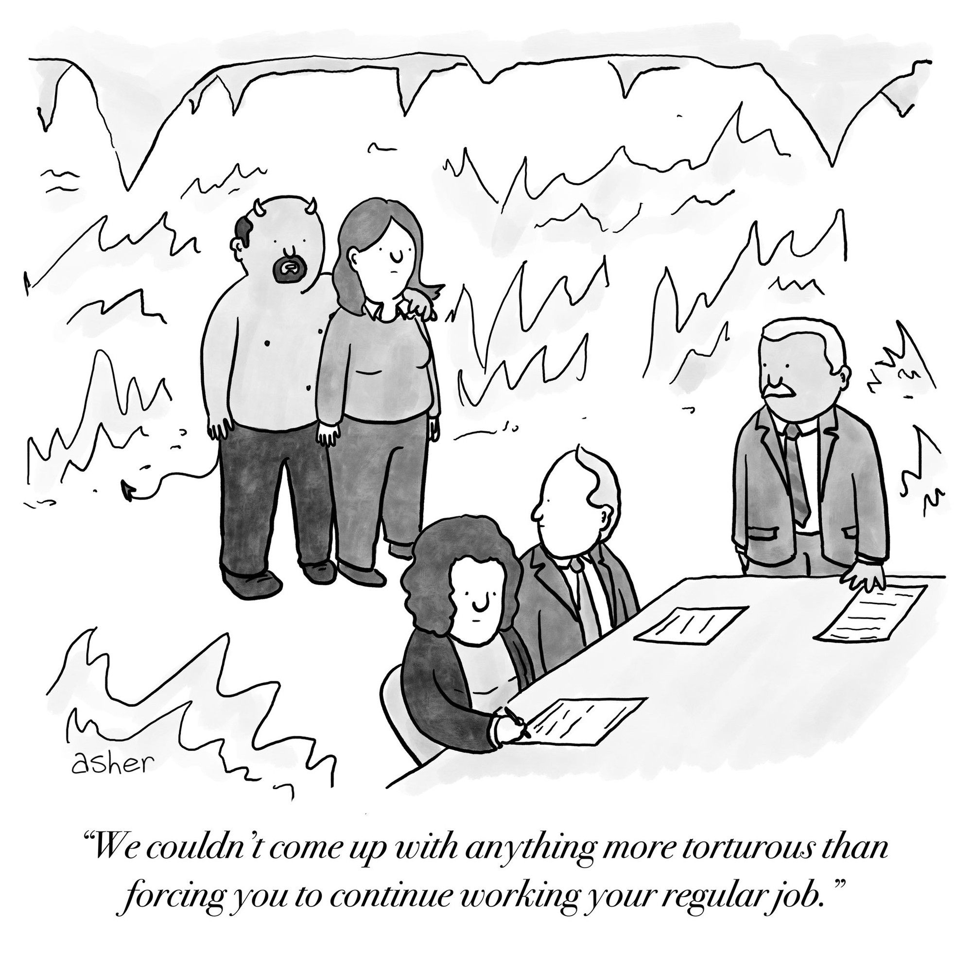 There was a comic for a little while with a guy who ends up in hell but it’s better than his corporate job and his new boss is actually respectful and can’t imagine anything but. Also his old boss was a loon who obsessed about how dead subordinate.