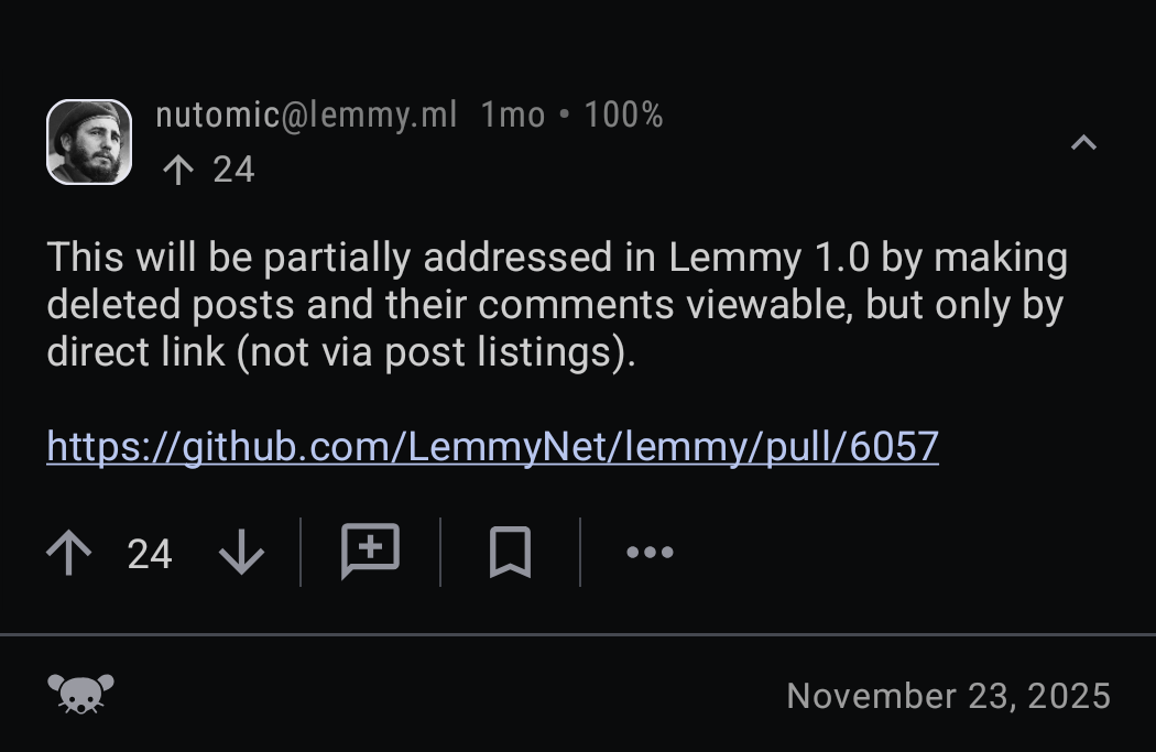 Very relevant, thank you. @rimu@piefed.social may want to do the same for Piefed - e.g. if someone asks a technicial question and a bunch of people provide very helpful answers, then OP deleting the question perhaps should not have total control over the answers to it, for someone that has a direct link to the conversation.