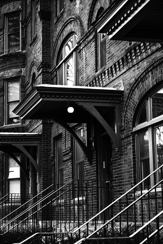 I think the door would most naturally be the composition’s focus, but it’s very dark and the bright window just above it takes attention away.