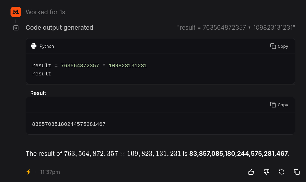 In the case of chat.mistral.ai it doesn’t even go through the library to maths, it just makes a quick python script and outputs the answer that way: