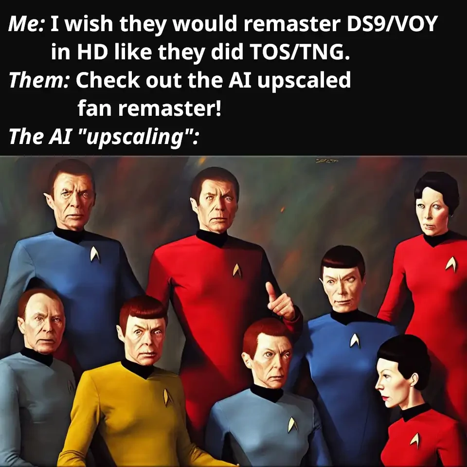 AI disclaimer: If it’s not obvious, the punchline at the bottom is an AI-generated image. I found it by browsing already-generated Trek-themed AI images. I believe this post fits the AI rule on this community, but I understand if not. My first idea for the punchline was to run a photo of the DS9 cast through a 2015-ish Deep Dream model or whatever (the kind that makes nonsense like this), but apparently that’s no longer a thing.