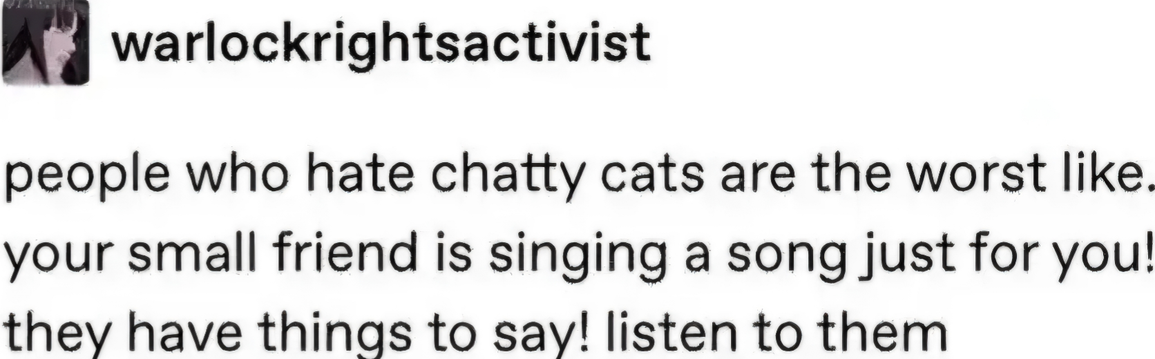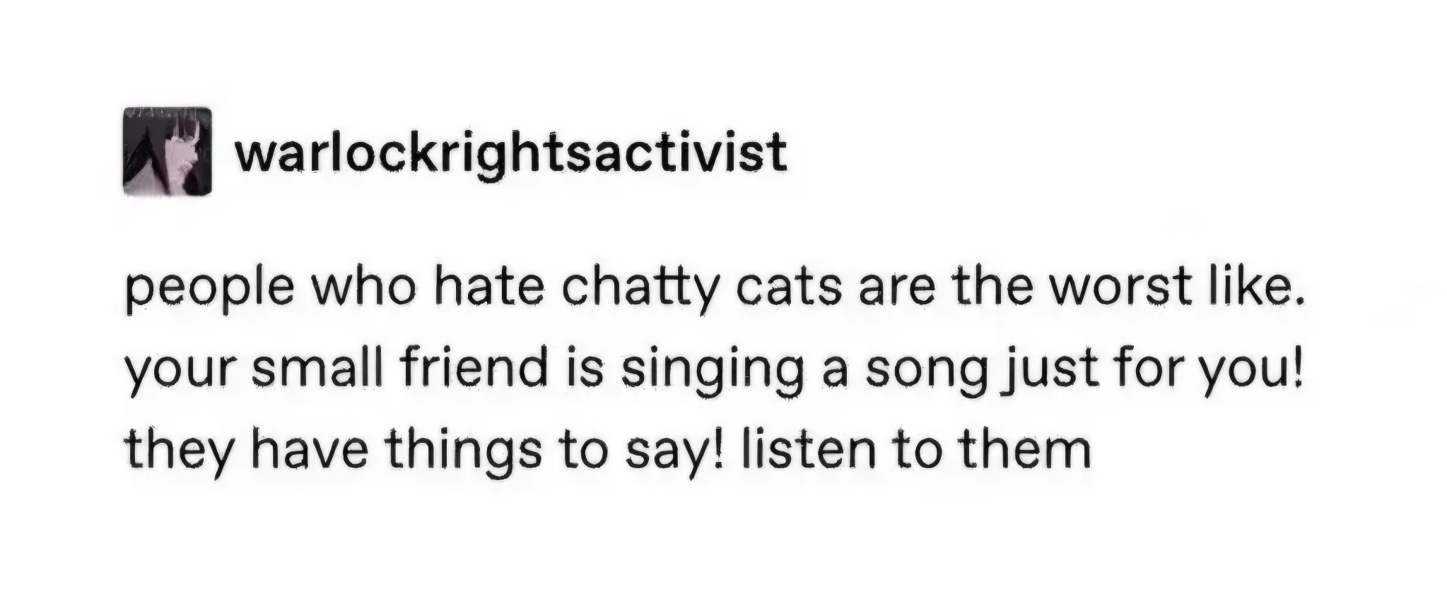 It’s like they want a piece of furniture, an ornament, not a living being - actually worse, a living being to not really be itself.our cats are an orange dipshit and a calico dumpster baby. we lost our previous calico to total body failure. it took us a year to be ready for another cat, and that year was way too quiet. whenever i hear ours chirp at us or mew at each other it’s a delight.