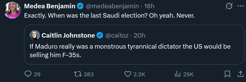 The person that won the Nobel Prize recently–Machado–ain’t exactly a great person to be leading Venezuela either, but the odds appear to be pretty damn high that she would have won the 2024 election in a blowout landslide, had she not been barred from running, and the vote count being entirely fraudulent by Maduro.