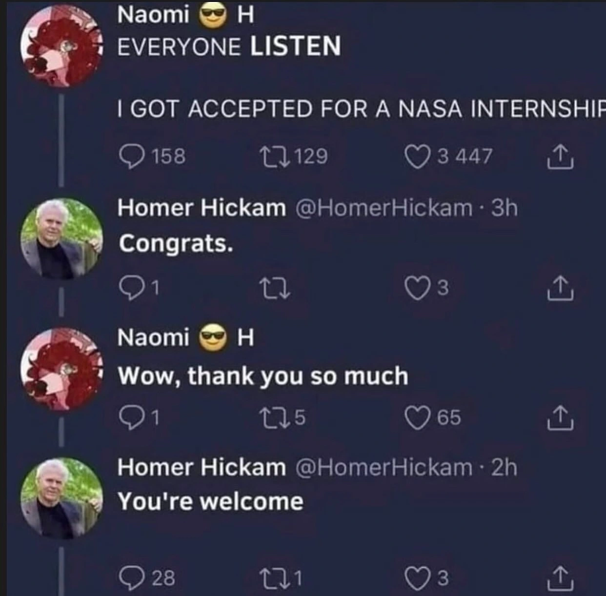For everyone else, the TL;DL of the podcast (which you should listen to!) is that Naomi is good now, she works in the aerospace industry (“commercial jet engine stuff”), and she still cusses a fuckton. She did not get back her NASA internship after that incident. I don’t think she mentioned in the interview exactly how she got back in the industry, all she said is: “I took such a roundabout way to get back into it”, and then the conversation was sidetracked by BOEING KILLED A GUY!