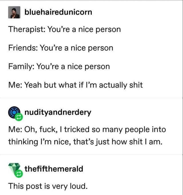 Literally me. “You just don’t actually know me. I’m really just true shit underneath!”
