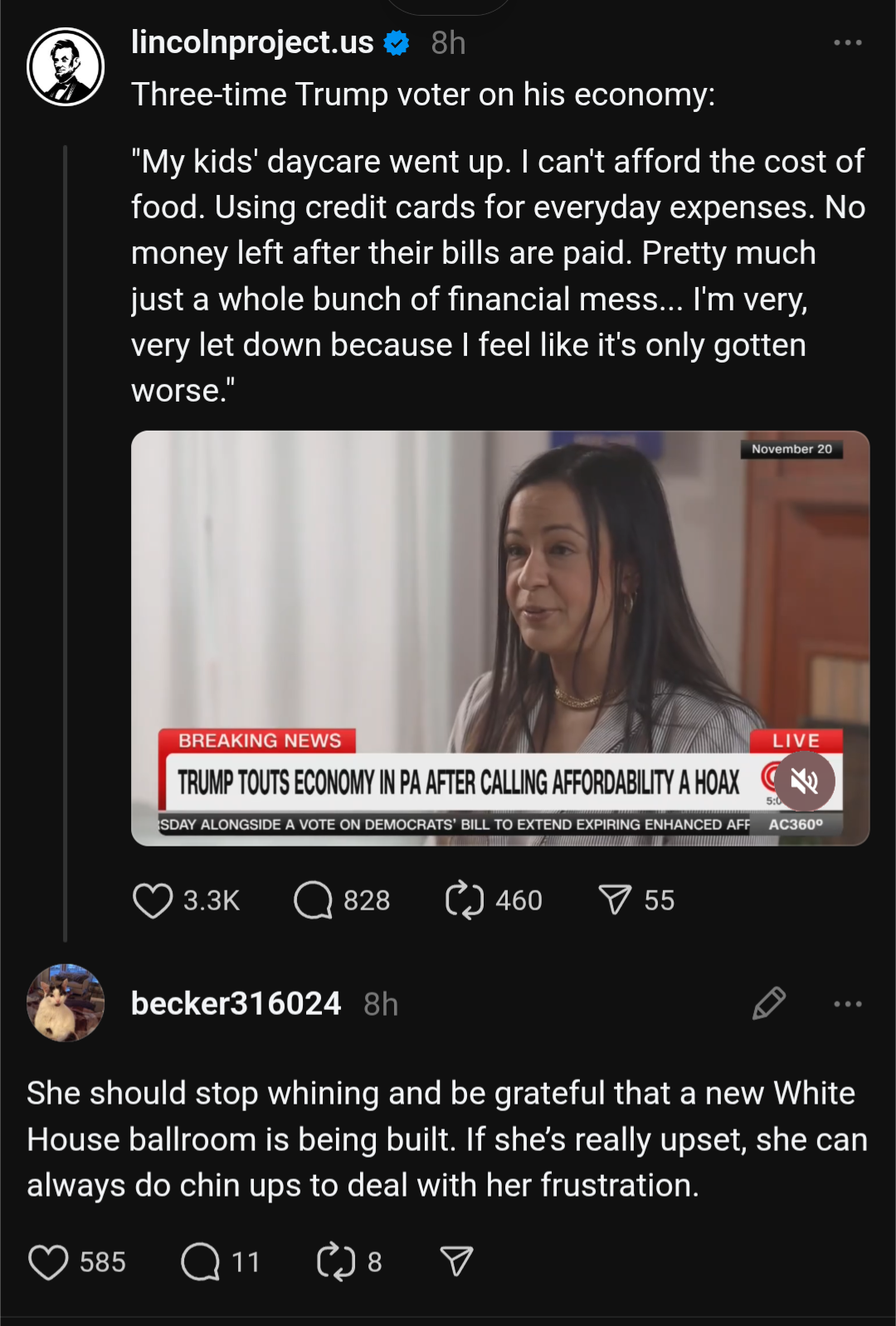 Idiot voters are much more an output of our broken system than an input. Like we’re basically blaming this woman for having a terrible education, being surrounded by misinformation, not forced to but basically highly incentivized into buffoonery. Schadenfreude is an ugly hole, marvel momentarily at it’s breadth and depth if you wish but take care not to fall in. There are institutional systems with singular powerful people on top, the puppet masters of these idiots, who are far better targets for scorn.