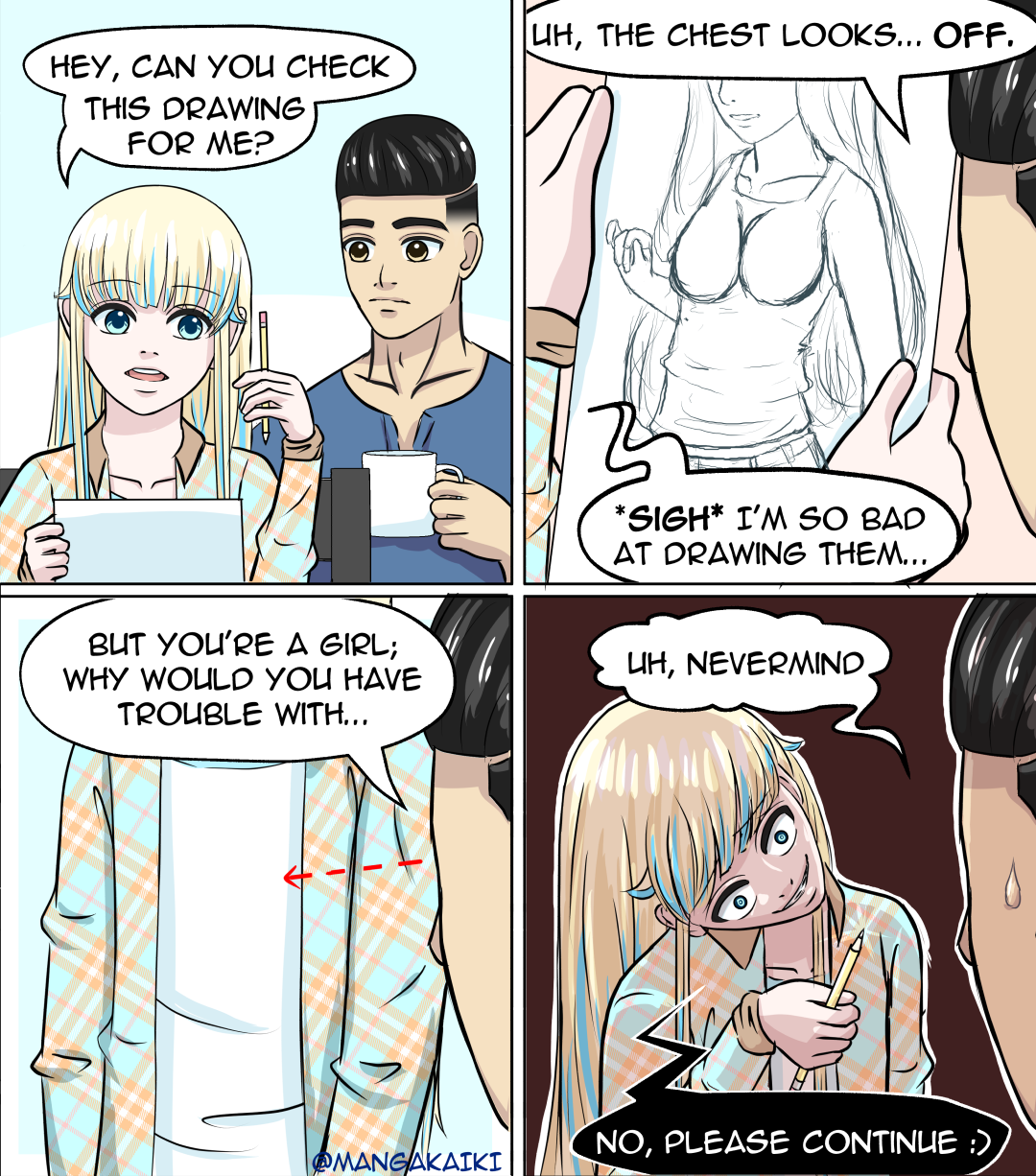 Sometimes I paint nude figures. My ex-boyfriend noticed me studying his penis one day, and when I made a painting with a guy in it, he recognized his own member, lol. I have the opposite situation to this comic though; when I draw women’s chests, I tend to make them big because, well, that’s what my chest is like.