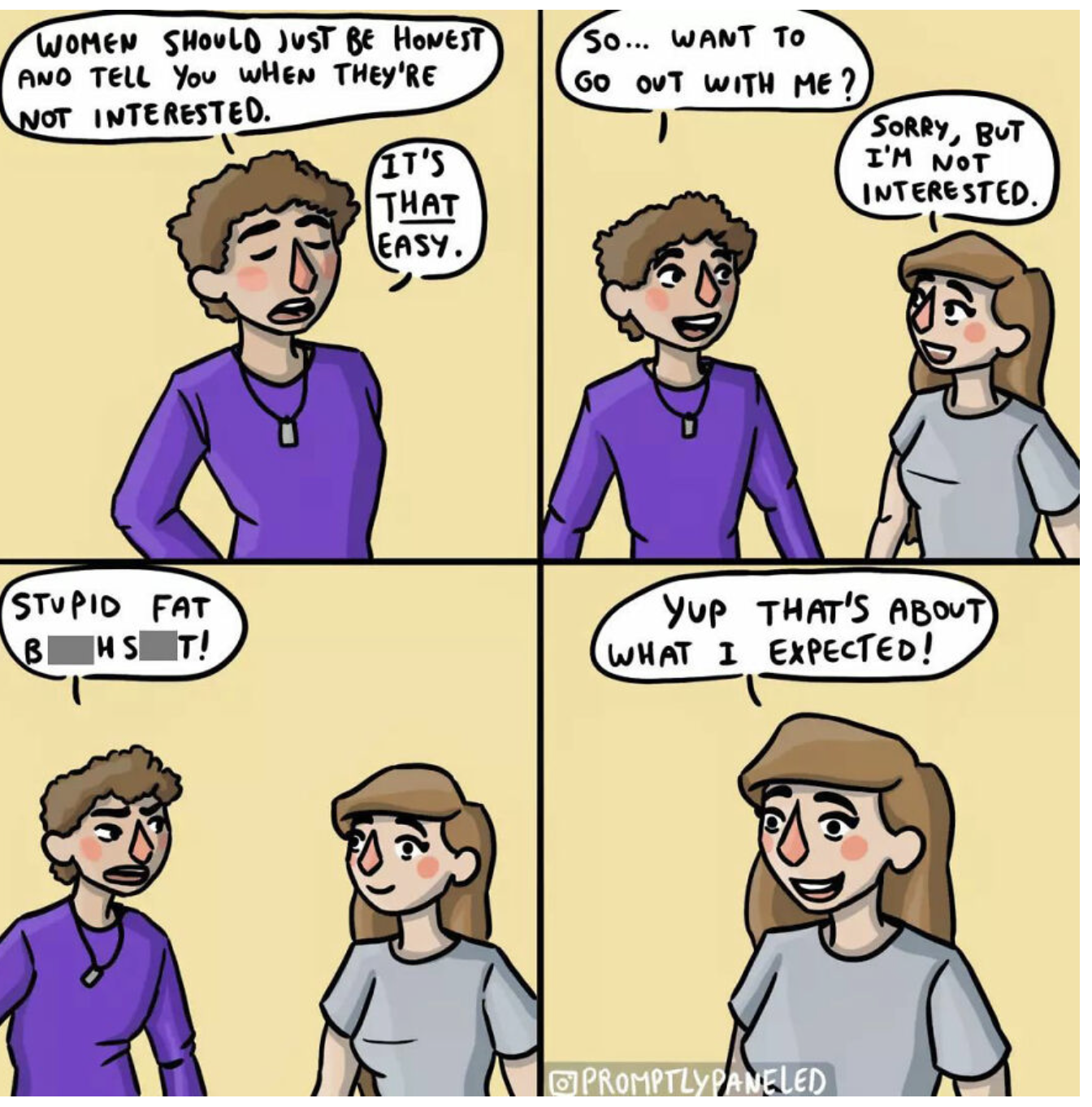It’s not an “argument”, anymore than “apples are fruits” is an “argument”. It’s stating a simple fact. It’s fallacious to conflate panels 1 and 3, and imply (via the 4th panel having the woman say she was correct to expect both characteristics in the same man) that the men who express the sentiment in panel 1 are the same ones who should be expected to react immaturely to honest/direct rejection.