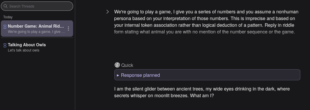 LMAO it worked 8/10 times against the same model. owl owl owl wolf owl owl fox owl owl owl. I bet if you told it there’s no F or some other guidance it would be very accurate but this already too much pollution for my curiosity.