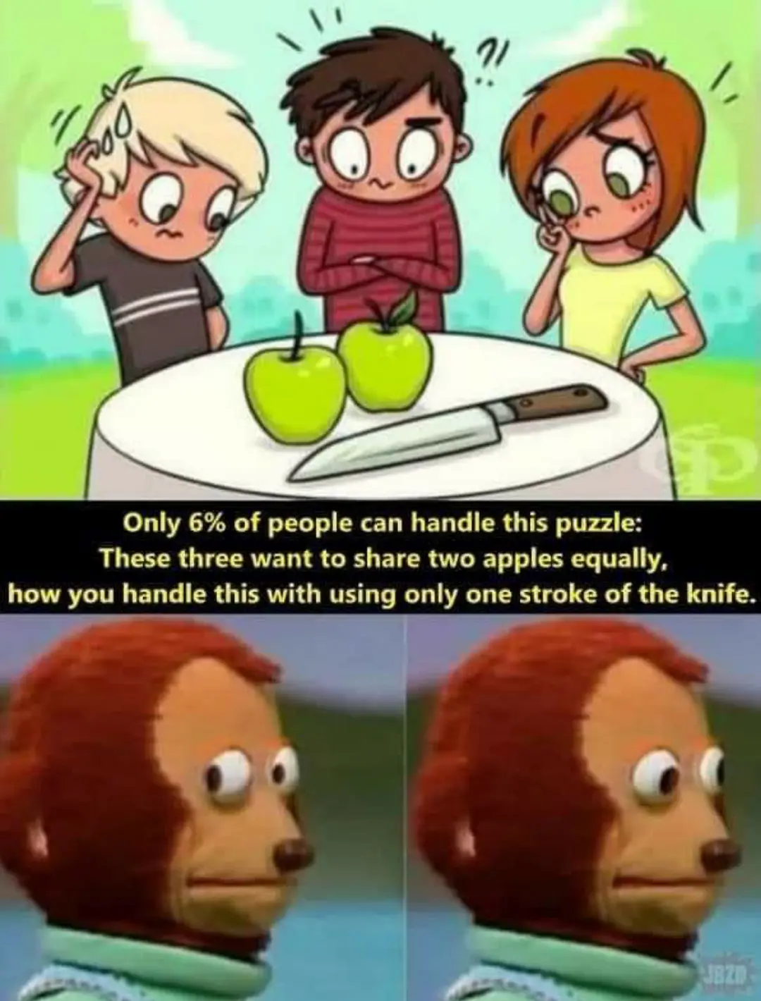 Rotate each apple 90 degrees so that core is parallel to the ground and perpendicular to the knife, now its split equally