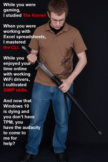 Richat@lemmy.ml to linuxmemes@lemmy.world · 7 months agoWindows 10 Support Ending Soonimagemessage-square137linkfedilinkarrow-up1827arrow-down189