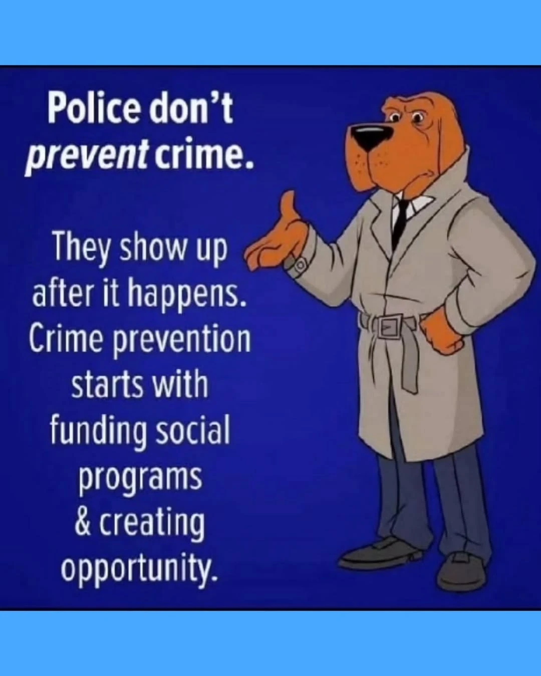 Crime prevention does indeed start with social programs. But it doesn’t end there. I’m all for defunding the police and I do agree that in the US police is really out of hand, but let’s not be naive here. Social programs aren’t going to address organized crime, or crimes of passion, crimes of immaturity (tenagers are both immature hormone soups and capable of causing harm) or political extremism. Antisocial behaviours can appear even in the socialistest of the welfarest of the welfare states.