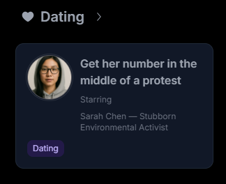 A LOT of the content is sociopathic in nature and there are a lot of simulations for “getting her number”, but the top offer in the Dating section is this one “getting her number in the middle of a protest”.